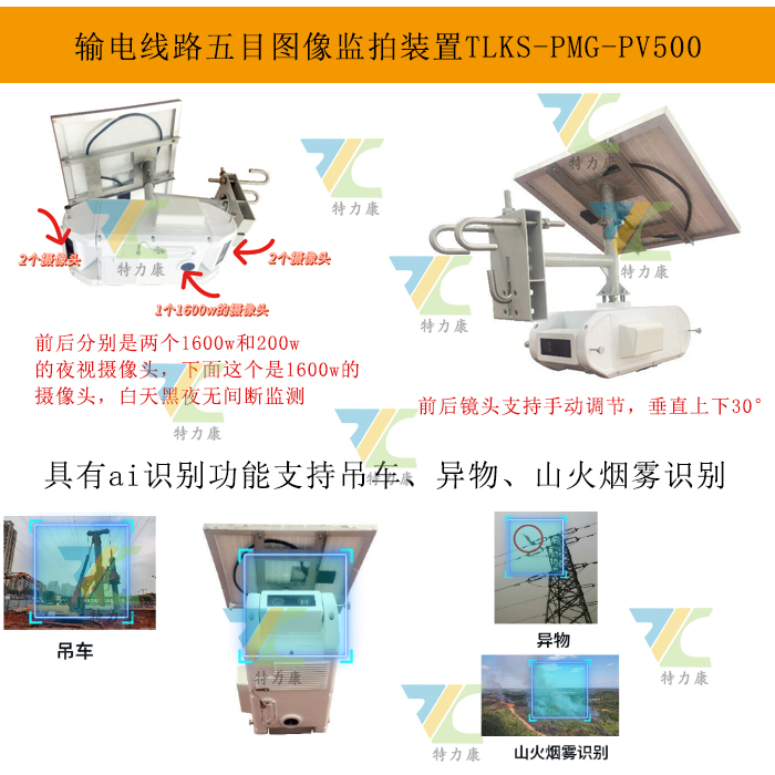我司研發(fā)的TLKS-PMG-PV500,是一款專為輸電線路設計的五目圖像監(jiān)拍裝置。在電力系統(tǒng)中,輸電線路常面臨外部因素導致的潛在威脅,如施工車輛誤觸、塔基損壞等。傳統(tǒng)監(jiān)拍裝置視野受限,難以全面監(jiān)控。TLKS-PMG-PV500通過前后各配置兩個攝像機及下方一個攝像機,實現了360°無死角監(jiān)控,有效解決了這一問題。