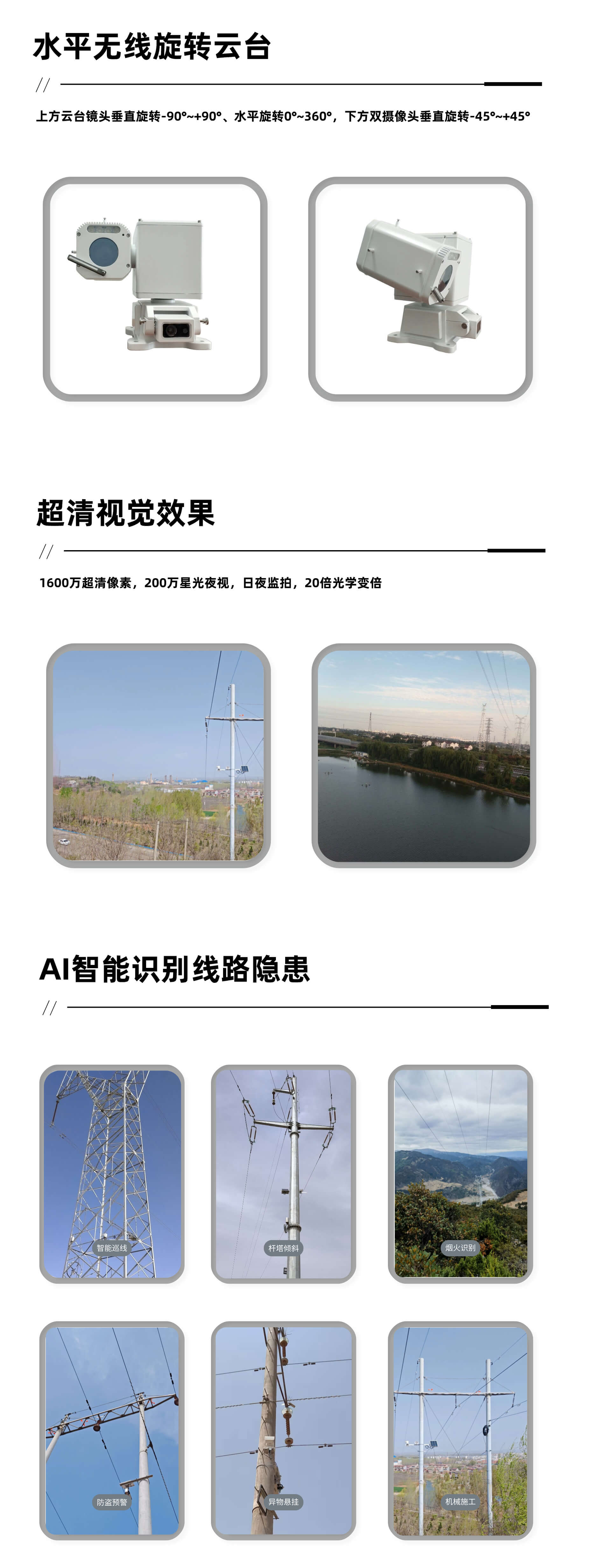 輸電線路智能多目視頻監(jiān)控裝置,搭載水平360°、垂直+90°旋轉(zhuǎn)全向云臺(tái)攝像頭,成就全景視野監(jiān)視,實(shí)時(shí)視頻瀏覽,三攝視頻,無(wú)論日夜,任何視角,即點(diǎn)即看,適配輕量級(jí)、低功耗AI算法,實(shí)現(xiàn)線路通道隱忠及桿塔本體缺陷的前端智能識(shí)別。