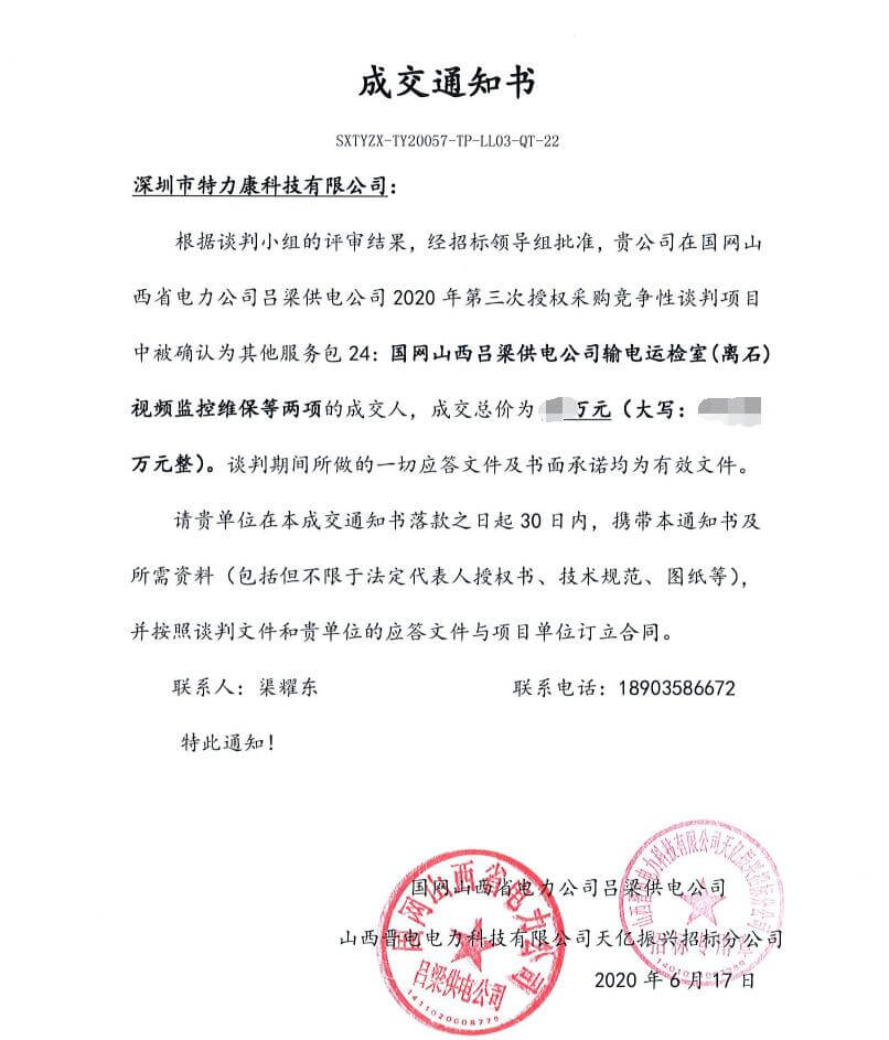 特力康中標國網(wǎng)黑龍江送變電工程公司的2024年度第18次物資類競爭性談判采購項目——慶陽驅(qū)鳥器物資框 特力康中標國網(wǎng)甘肅省電力公司省管產(chǎn)業(yè)單位2024年第五次物資競爭性談判授權采購項目 中標喜訊:深圳市特力康科技有限公司成功入圍許繼集團綜合能源公司輸電線路視頻在線監(jiān)測裝置模塊集采項目 中標喜訊:特力康成功中標國網(wǎng)重慶市電力公司渝中一片區(qū)項目 特力康成功中標國網(wǎng)天津市電力公司2024年第二次?物?資招標項目 特力康中標國網(wǎng)安徽省電力有限公司蕪湖供電公司2024年3月非物質(zhì)采購項目 精準捕捉 “微氣象”:浙江電力用特力康預警系統(tǒng)筑牢電網(wǎng)氣候防線 守護 “電力咽喉”:湖南電力投用百套特力康三跨 4G 監(jiān)控球,筑牢安全防線 貴州電力裝特力康電網(wǎng)架空線路覆冰監(jiān)測系統(tǒng),精準防冰保電網(wǎng)過冬? 百套落地山西電網(wǎng)!特力康輕量化輸電架空線路監(jiān)拍裝置,筑牢輸電安全網(wǎng) 破解采空區(qū)隱患:山西電力裝特力康通用型監(jiān)測裝置,守鐵塔穩(wěn)運行 四川電力用特力康架空輸電線路山火監(jiān)測裝置,筑牢林區(qū)輸電 “防火墻”? 遼寧電力啟用特力康多視角監(jiān)拍裝置,全維度守護輸電安全? 破解黃土高原沉降難題:山西電力用特力康北斗裝置守桿塔安全? 寧夏配電線路安裝了我司防外破電子化智能警示牌