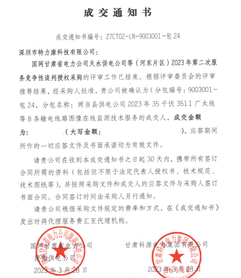 國網(wǎng)甘肅省電力公司天水供電公司等(河東片區(qū)) 2023年第二次服務(wù)競爭性談判授權(quán)采購的評審工作已結(jié)束。根據(jù)評審委員會的評審?fù)扑]結(jié)果,經(jīng)采購人批準,我司被確認為(分包編號: 9003001-包24,分包名稱:兩當縣供電公司2023年35千伏3511廣太線等8條輸電線路圖像在線監(jiān)測技術(shù)服務(wù)的成交人,成交通知如下: