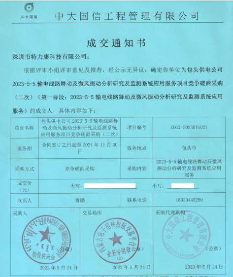 依據(jù)評(píng)審小組評(píng)審意見及推薦,經(jīng)公示無異議,確定我司為包頭供電公司2023-5-5輸電線路舞動(dòng)及微風(fēng)振動(dòng)分析研究及監(jiān)測(cè)系統(tǒng)應(yīng)用服務(wù)項(xiàng)目競(jìng)爭(zhēng)磋商采購(gòu)(二次) (第一標(biāo)段: 2023-5-5 輸電線路舞動(dòng)及微風(fēng)振動(dòng)分析研究及監(jiān)測(cè)系統(tǒng)應(yīng)用服務(wù))的成交人,具體內(nèi)容如下: