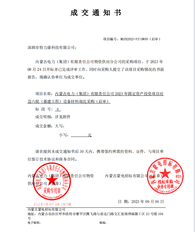 內(nèi)蒙古電力(集團(tuán))有限責(zé)任公司物資供應(yīng)分公司的采購項(xiàng)目,于2023年08月24日開標(biāo)并已完成評(píng)審工作,同時(shí)向采購人提交了該項(xiàng)目采購情況的書面報(bào)告,現(xiàn)確認(rèn)我單位為成交單位,中標(biāo)通知如下: