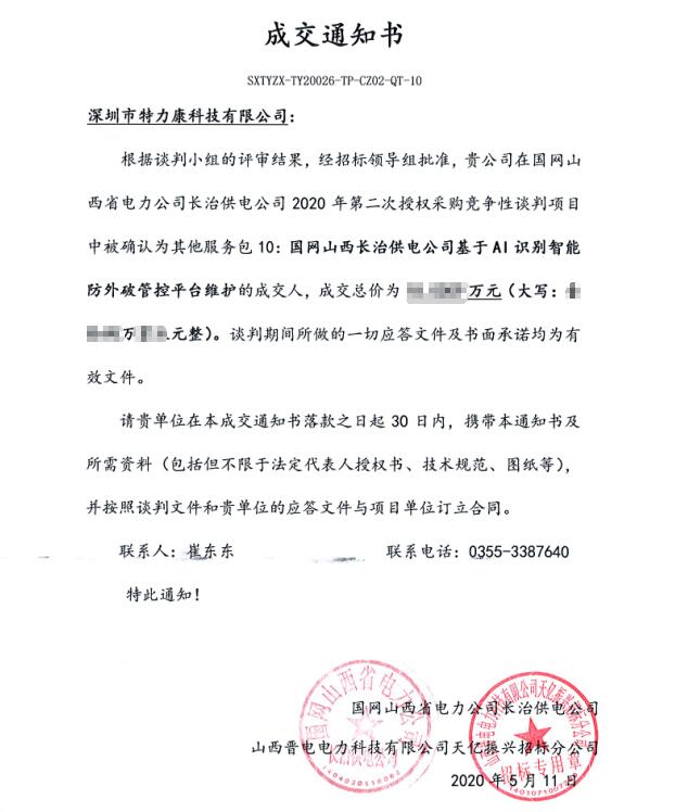 根據(jù)談判小組的評審結(jié)果,經(jīng)招標領(lǐng)導(dǎo)組批準,我司(深圳市特力康科技有限公司)在國網(wǎng)山西省電力公司長治供電公司2020年第二次授權(quán)采購競爭性談判項目中被確認為其他服務(wù)包10:國網(wǎng)山西長治供電公司基于AI識別智能防外破管控平臺維護的成交人。現(xiàn)附中標通知書如下: