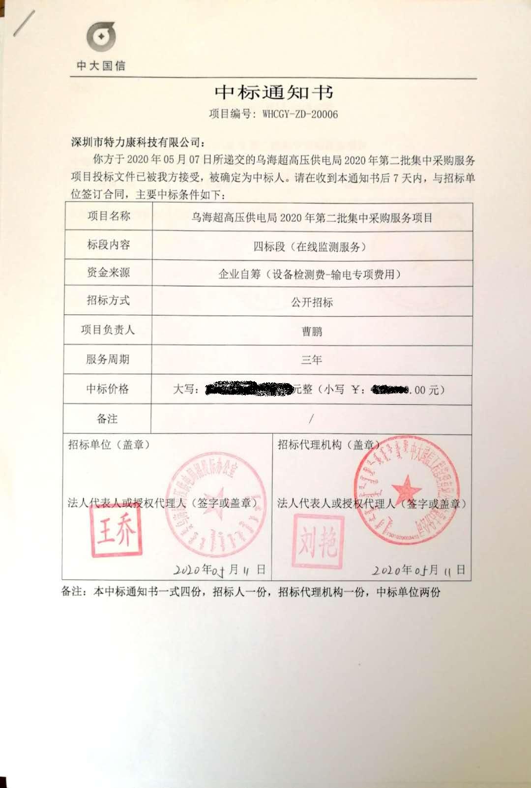 經(jīng)招標領導組批準,我司于2020年05月07日所遞交的烏海超高壓供電局2020年第二批集中采購服務項目(四標段:在線監(jiān)測服務)投標文件已被局方接受,被確定為中標人。特發(fā)中標通知書,如下: