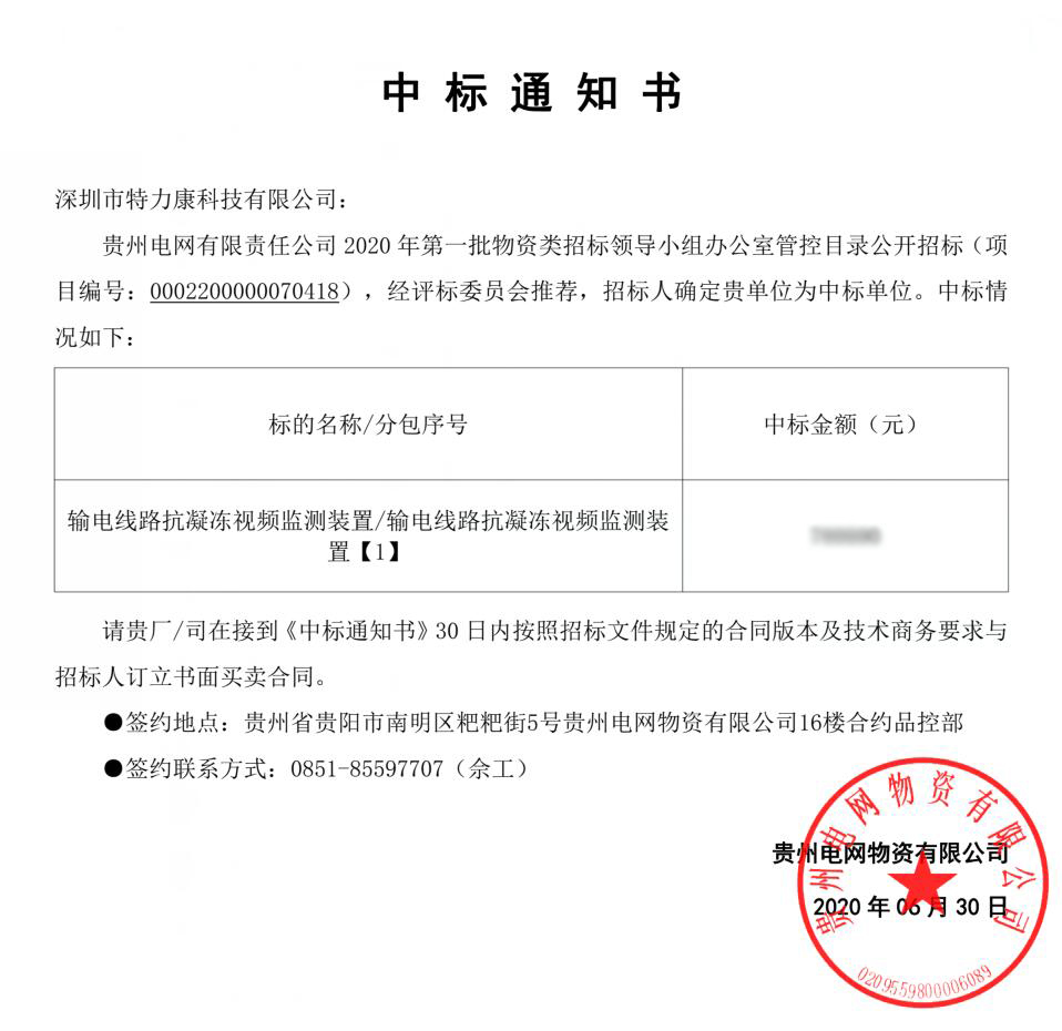 我司(深圳市特力康科技有限公司)在投標(biāo)貴州電網(wǎng)有限責(zé)任公司2020年第一批物資類招標(biāo)領(lǐng)導(dǎo)小組辦公室管控目錄公開招標(biāo)(項(xiàng)目編號: 0000000070418) 中輸電線路抗凝凍視頻監(jiān)測裝置標(biāo)包,經(jīng)評標(biāo)委員會推薦,招標(biāo)人確定我司為中標(biāo)單位。特發(fā)中標(biāo)通知書,如下: