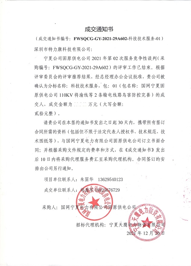 寧夏公司固原供電公司2021年第02次服務(wù)競(jìng)爭(zhēng)性談判(采購(gòu)編號(hào): FWSQCG-GY-2021-29A602) 的評(píng)審工作已結(jié)束。根據(jù)評(píng)審委員會(huì)的評(píng)審?fù)扑]結(jié)果,經(jīng)總經(jīng)理辦公會(huì)議批準(zhǔn),貴公司被確認(rèn)為分標(biāo)名稱:科技技術(shù)服務(wù),包: 01 (包名稱:國(guó)網(wǎng)寧夏固原供電公司110KV將渝線等2條輸電線路鳥(niǎo)害防控完善)的成交人,成交通知如下: