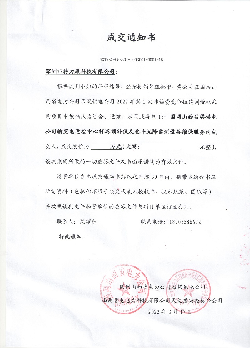 根據(jù)談判小組的評審結(jié)果,經(jīng)招標領(lǐng)導(dǎo)組批準,我司在國網(wǎng)山西省電力公司呂梁供電公司2022年第1次非物資競爭性談判授權(quán)采購項目中被確認為綜合、運維、零星服務(wù)包15:國網(wǎng)山西呂梁供電公司輸變電運檢中心桿塔傾斜儀及北斗沉降監(jiān)測設(shè)備維保服務(wù)的成交人,成交通知如下: