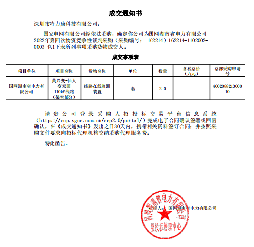 深圳市特力康科技有限公司:國(guó)家電網(wǎng)有限公司經(jīng)依法采購(gòu),確定你公司為國(guó)網(wǎng)湖南省電力有限公司2022年第四次物資競(jìng)爭(zhēng)性談判采購(gòu)(采購(gòu)編號(hào): 162214) 162214-1102002-0003包1下表所列事項(xiàng)采購(gòu)貨物成交人。中標(biāo)通知如下: