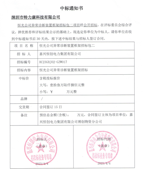 恒光公司異常診斷裝置框架招標(biāo)包二項(xiàng)目經(jīng)公開招標(biāo),在評標(biāo)委員會綜合評議,擇優(yōu)推薦和評標(biāo)結(jié)果公示的基礎(chǔ)上,現(xiàn)選定我司為中標(biāo)人,中標(biāo)通知如下: