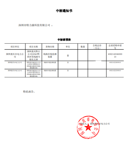 我司(深圳市特力康科技有限公司)中標國網重慶市電力公司2023年第二次物資公開招標采購-線路在線監(jiān)測裝置-可視化(架空),中標通知如下: